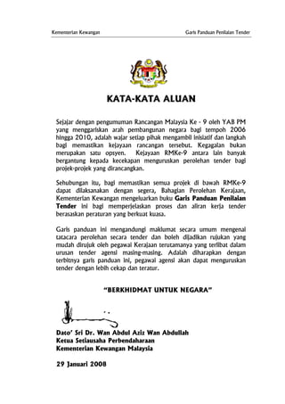 Panel Penilai Tender bertanggungjawab menilai setiap dokumen tender yang diterima. Kementerian Kewangan Garis Panduan Penilaian Tender syarikat usaha sama yang diperbadankan di Malaysia tidak kira sama ada disenaraikan di BSKL atau tidak dengan syarat pegangan ekuiti asing tidak melebihi empat puluh sembilan peratus 49 dan majoriti ahli Lembaga Pengarah pengurusan dan pekerja adalah warganegara. Tarikh.